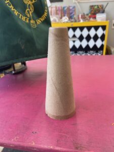 Wide bottom, smaller top. Cone is 6 3/4″ high with a 2 5/8″ diameter base.  Top is 1 1/4″ diameter.